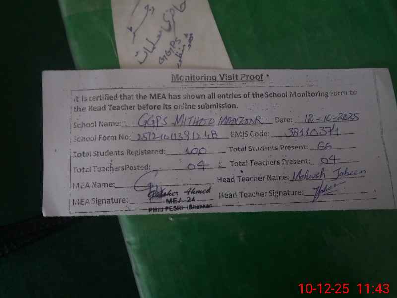 | EMIS Code: 38110374 | Name of School: GGPS MITHO MANZOOR | |||