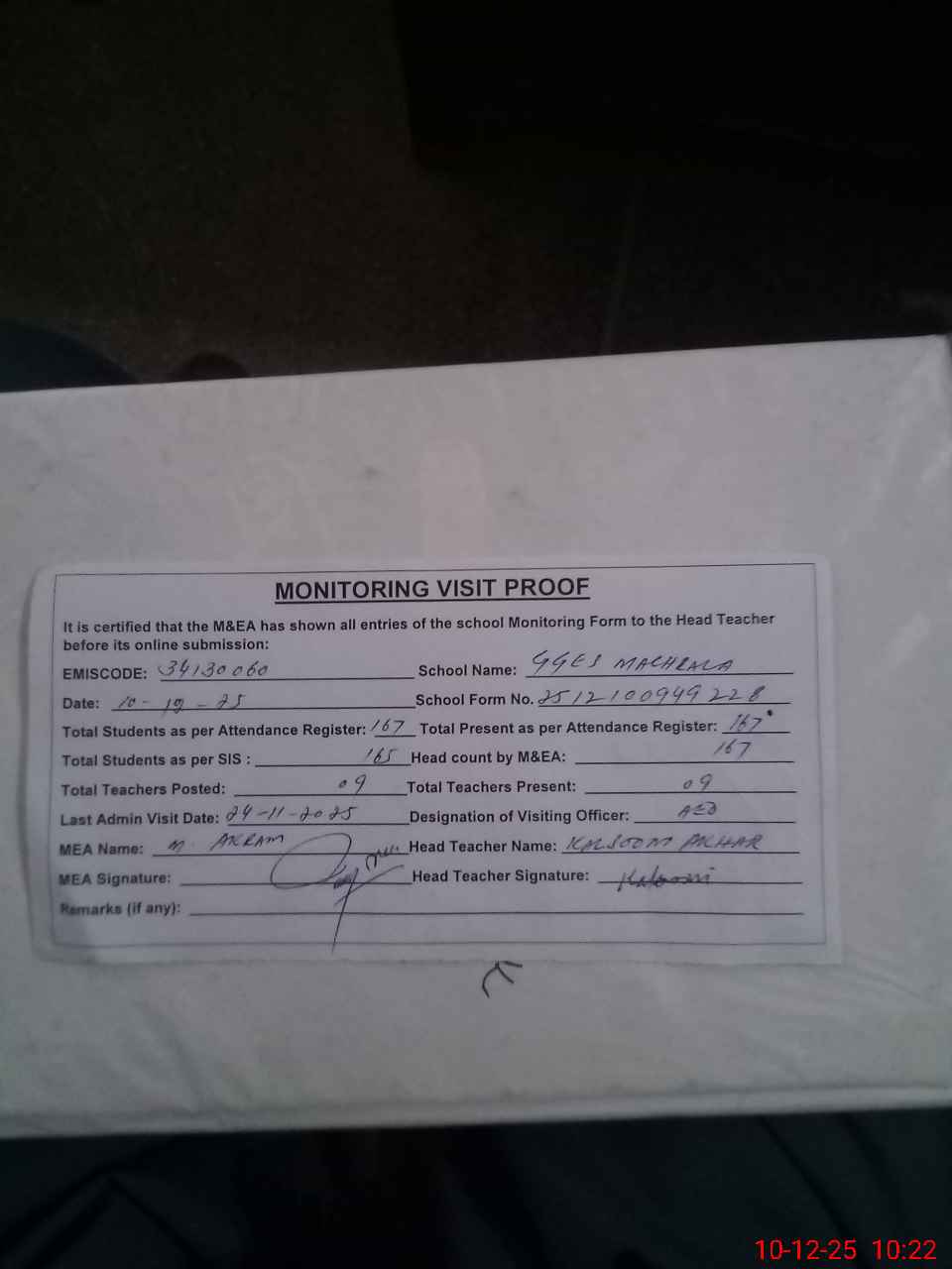 | Monitoring Date: 10-12-2025 | Start Time: 10-12-2025 09:48 AM | End Time: 10-12-2025 10:23 AM | Name of MEA: K-**** Ak**** | |