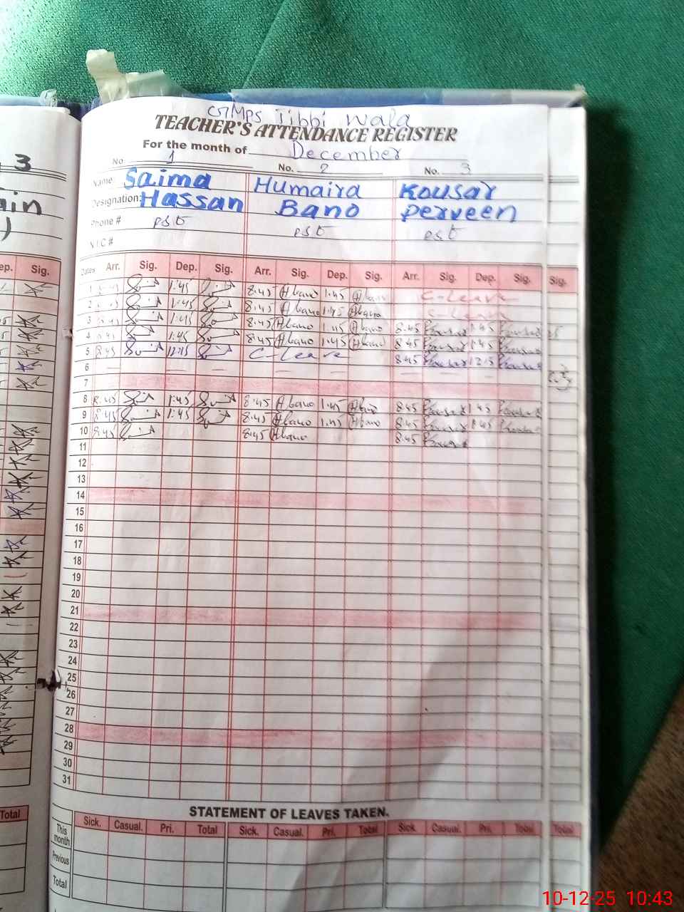 | Leave | Duty | Absent | Maternity | Medical | Ex- Pak |