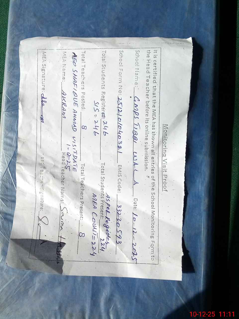 | Attendance Register | Head Teacher | MEA with School | Visit Proof |