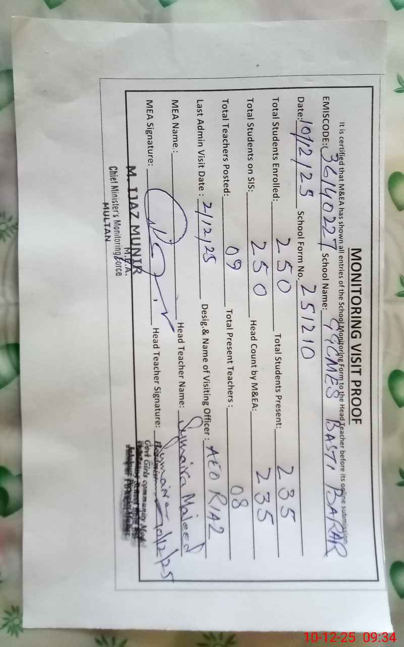 | Certified that this School was Inspected by the Undersigned MEA/DMO Today and the Information Stated Above is as Per Record. | |||||
