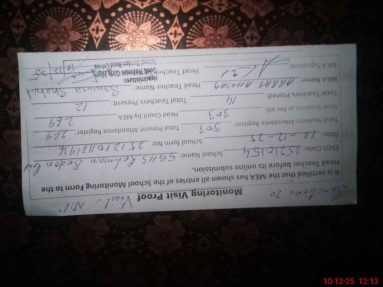 | Certified that this School was Inspected by the Undersigned MEA/DMO Today and the Information Stated Above is as Per Record. | |||||