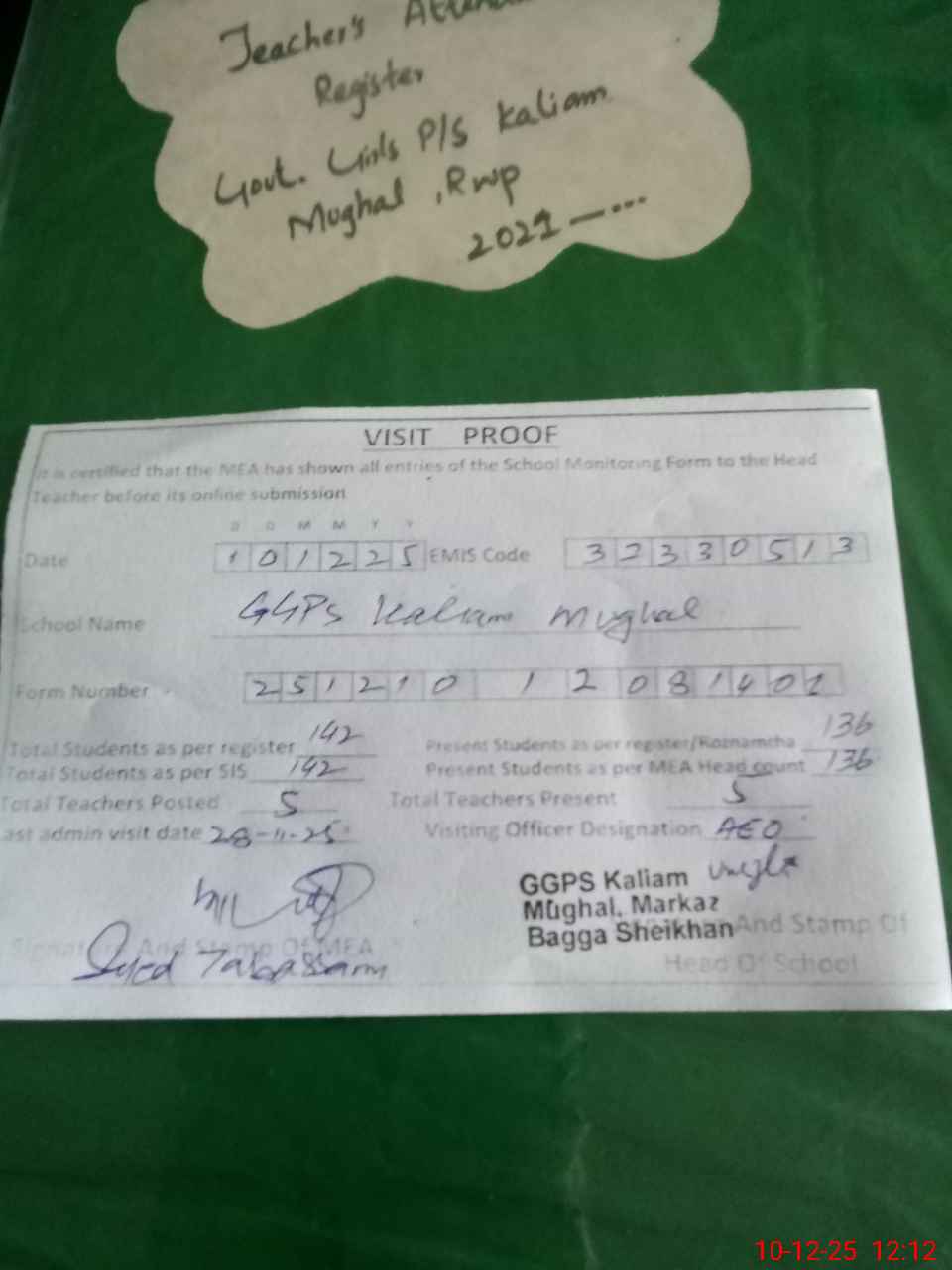 | Attendance Register | Head Teacher | MEA with School | Visit Proof |