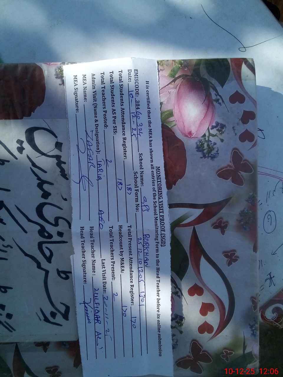 | Attendance Register | Head Teacher | MEA with School | Visit Proof |