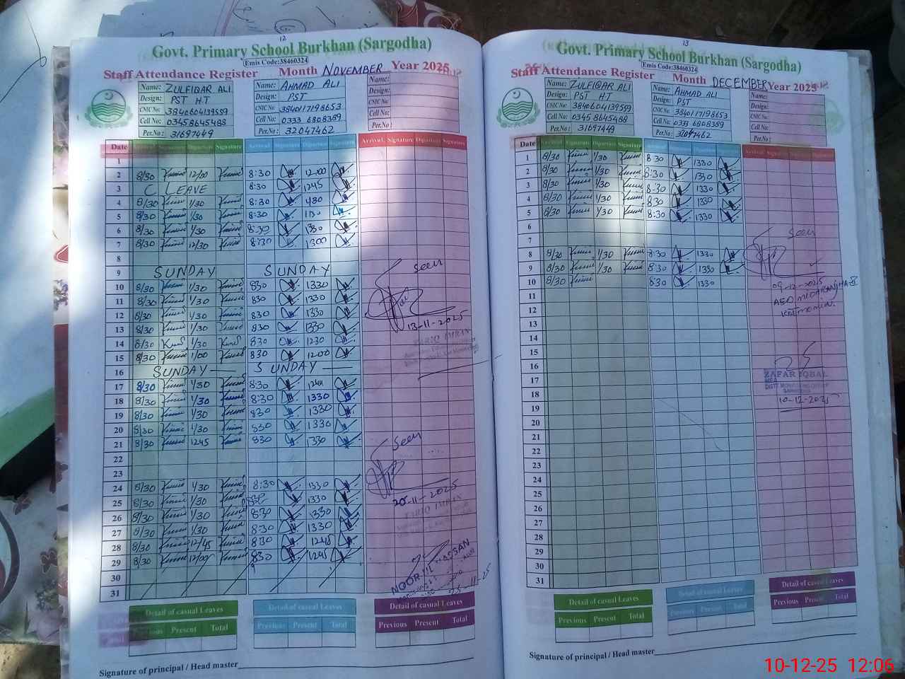 | CNIC | Full Name | Designation | R/C | Absence during last cal. month |