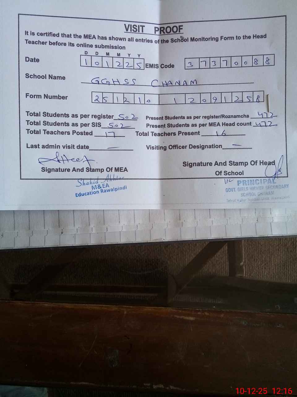 | Attendance Register | Head Teacher | MEA with School | Visit Proof |
