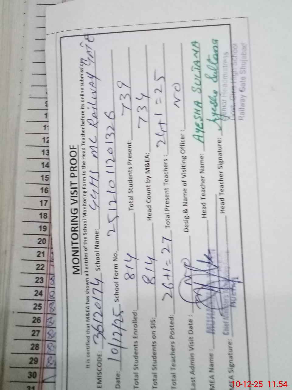 | EMIS Code: 36120174 | Name of School: GGHS MC RAILWAY GATE SHUJABAD | |||