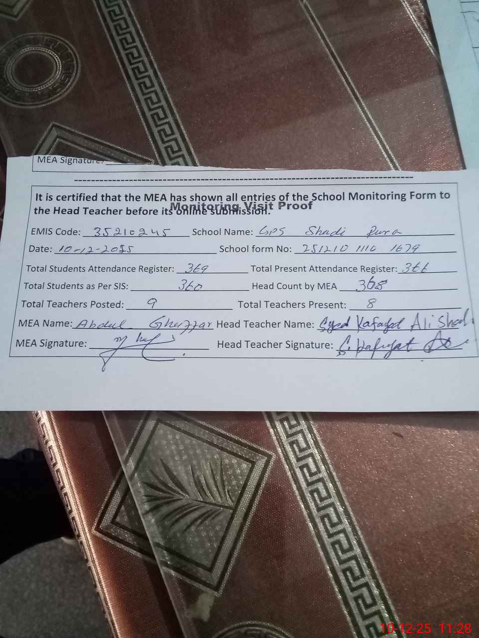 | Certified that this School was Inspected by the Undersigned MEA/DMO Today and the Information Stated Above is as Per Record. | |||||