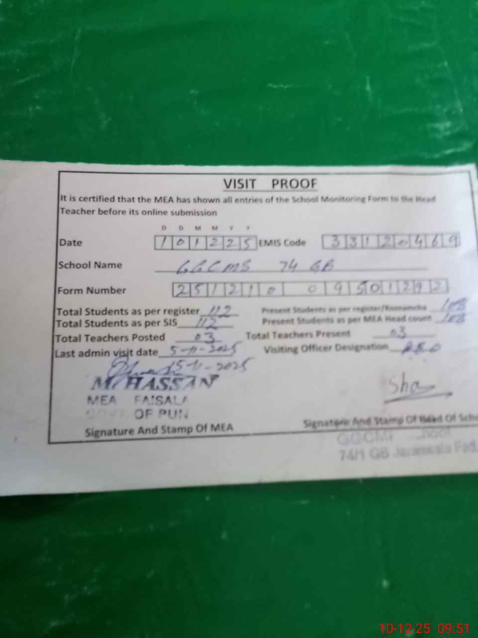 | EMIS Code: 33120469 | Name of School: GGCMS CHAK 74 GB I SATIANA | |||
