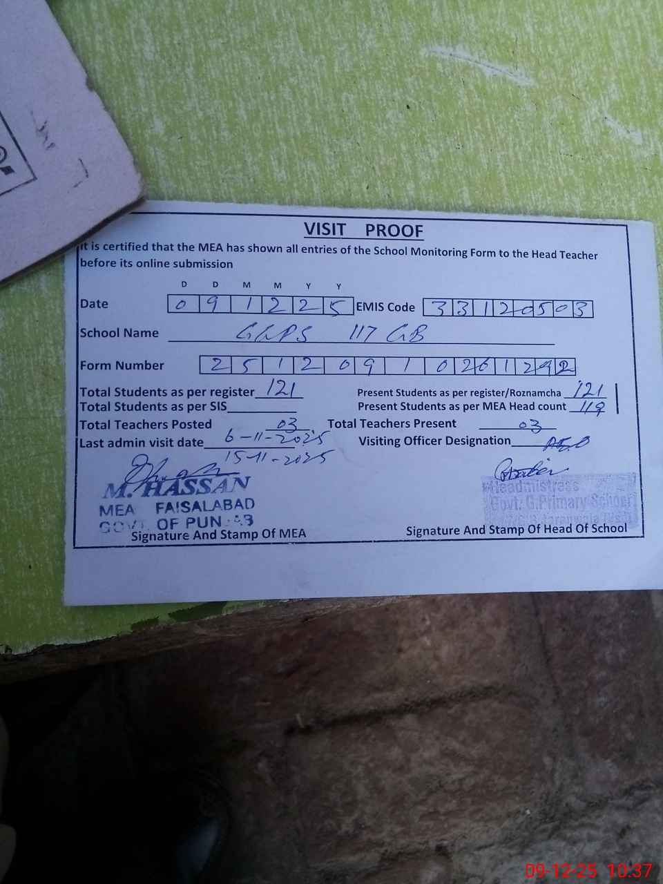 | Attendance Register | Head Teacher | MEA with School | Visit Proof |