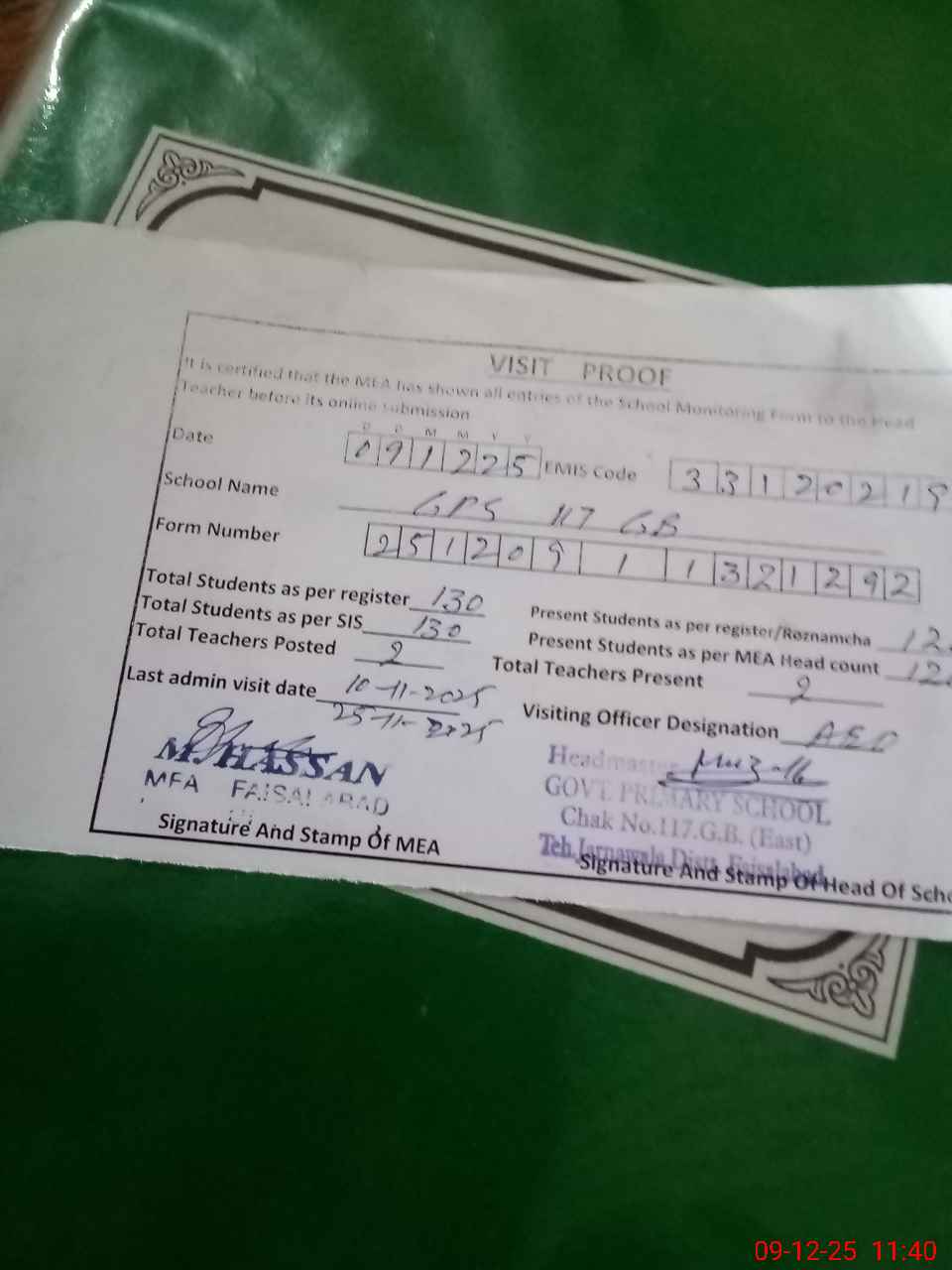 | Attendance Register | Head Teacher | MEA with School | Visit Proof |