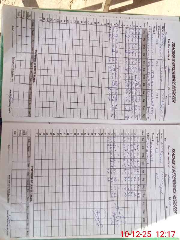 | CNIC | Full Name | Designation | R/C | Absence During Last Calender Month |