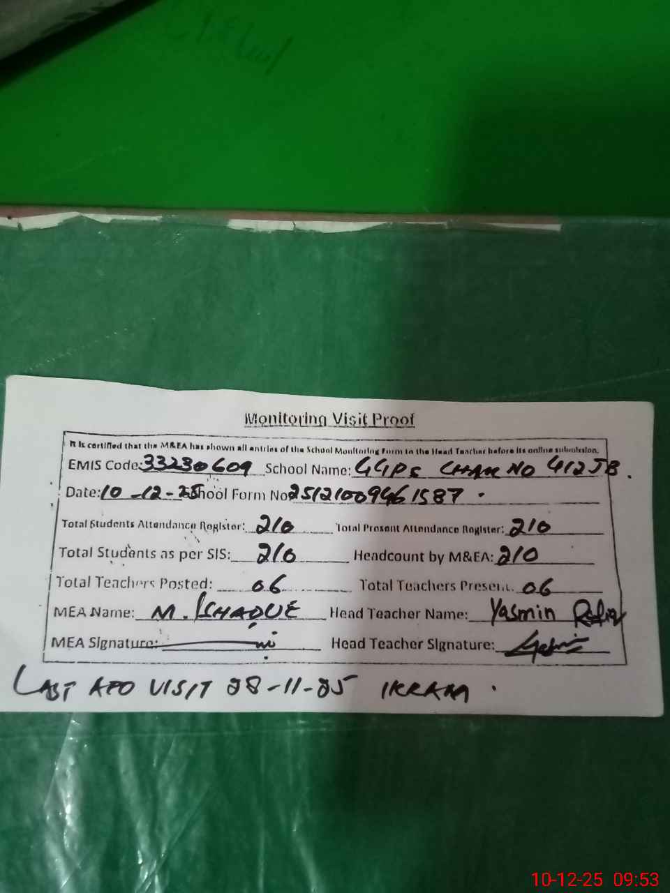 | EMIS Code: 33230609 | Name of School: GGPS CHAK NO 412 JB CHEEMIAN WALA | |||