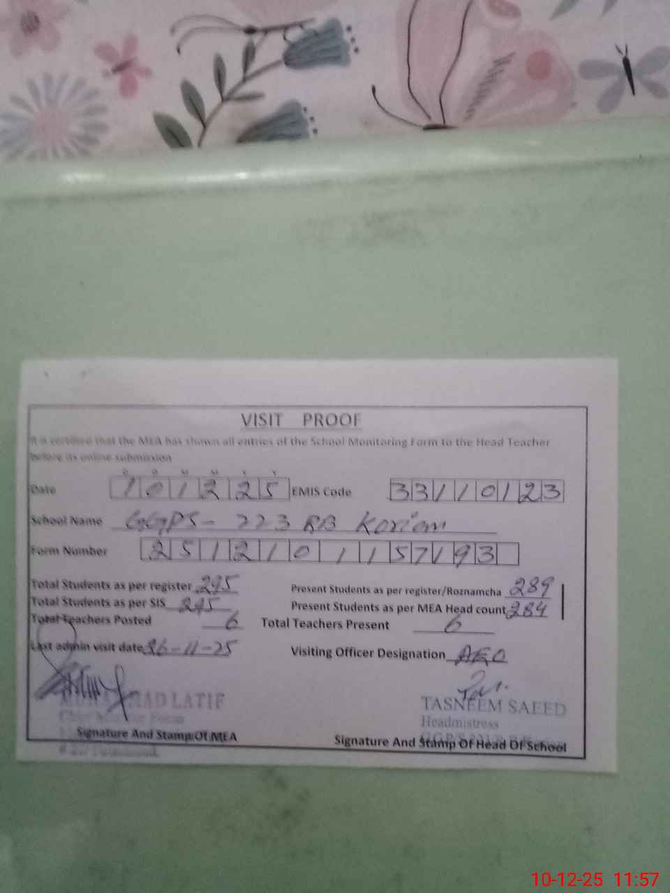 | EMIS Code: 33110123 | Name of School: GGPS KORIAN FAISALABAD | |||
