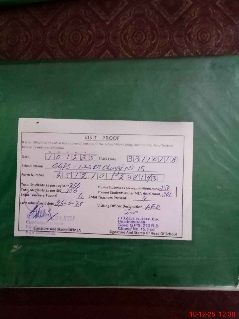 | EMIS Code: 33110118 | Name of School: GGPS CHAK NO 223 RB CHUNGI 15 | |||