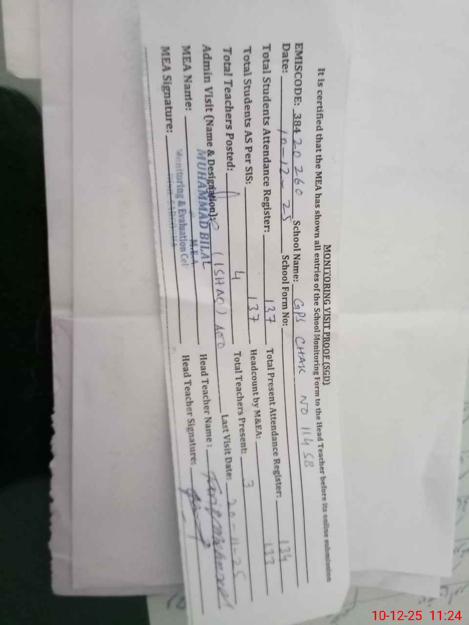 | Attendance Register | Head Teacher | MEA with School | Visit Proof |