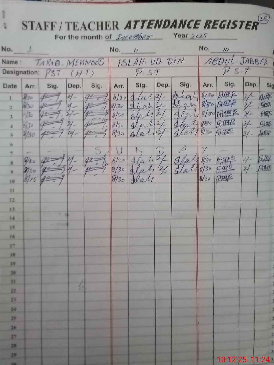 | CNIC | Full Name | Designation | R/C | Absence during last cal. month |