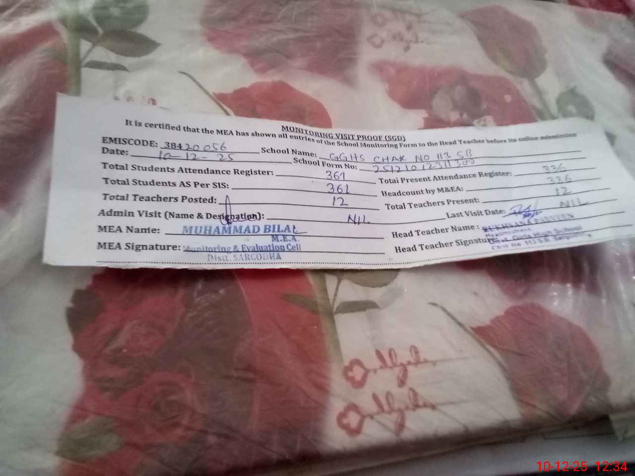 | Attendance Register | Head Teacher | MEA with School | Visit Proof |