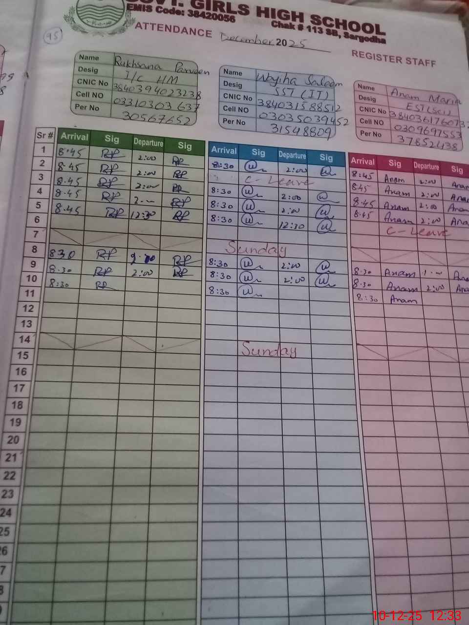 | CNIC | Full Name | Designation | R/C | Absence during last cal. month |