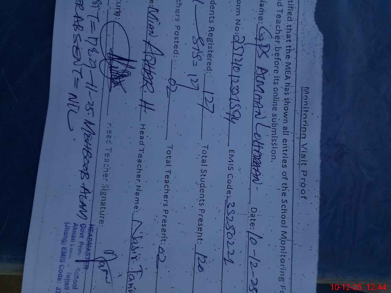 | Certified that this School was Inspected by the Undersigned MEA/DMO Today and the Information Stated Above is as Per Record. | |||||