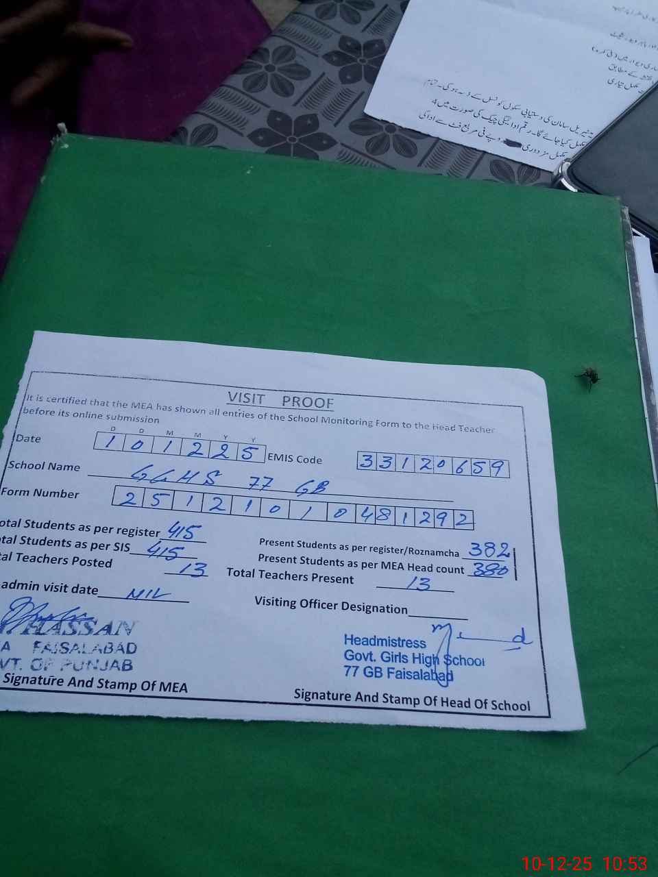 | EMIS Code: 33120659 | Name of School: GGHS CHAK 77 GB SATIANA | |||