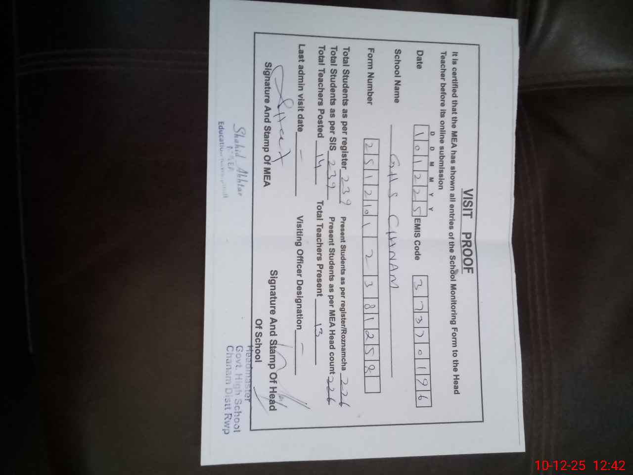 | Certified that this School was Inspected by the Undersigned MEA/DMO Today and the Information Stated Above is as Per Record. | |||||