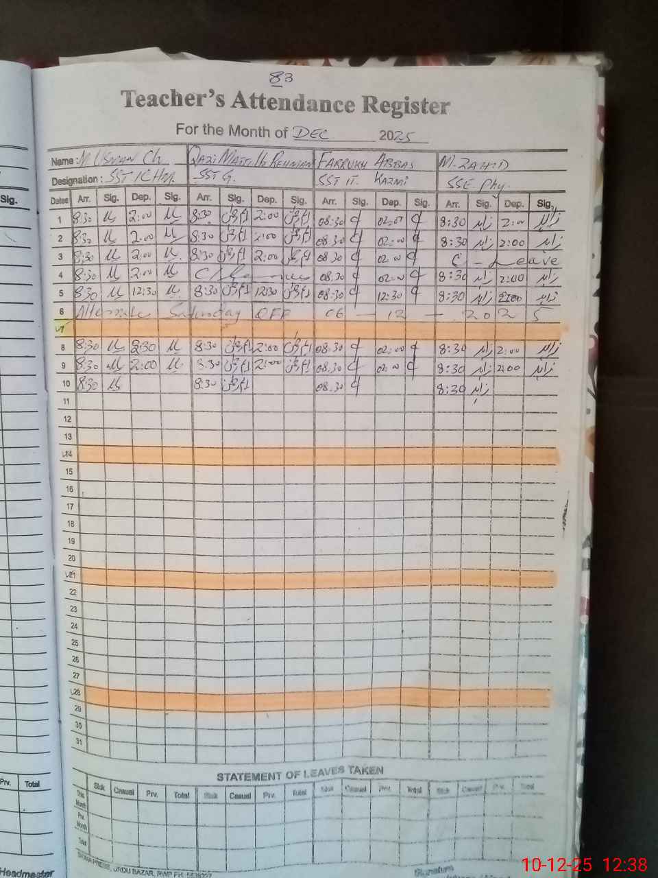 | CNIC | Full Name | Designation | R/C | Absence During Last Calender Month |