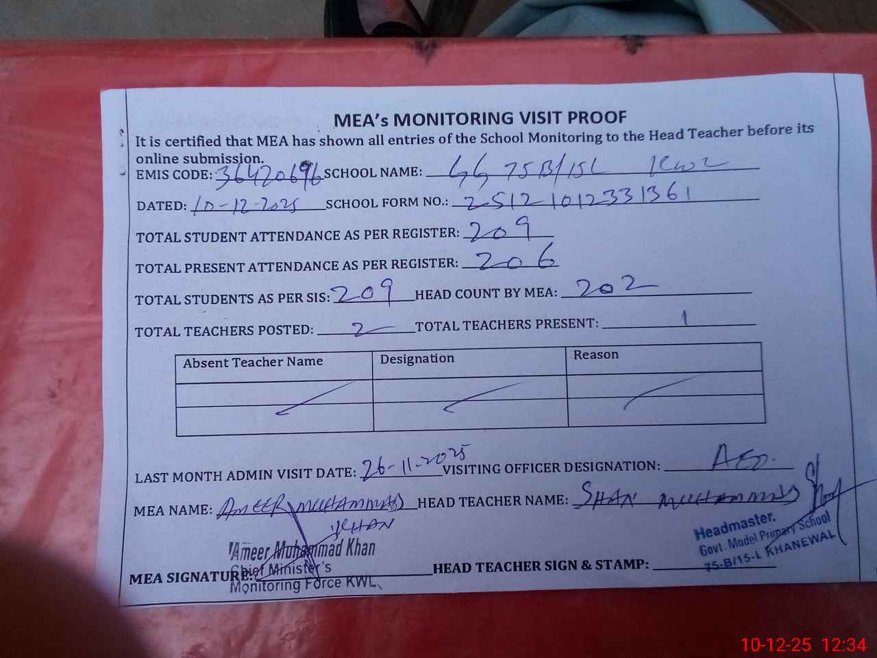 | Attendance Register | Head Teacher | MEA with School | Visit Proof |