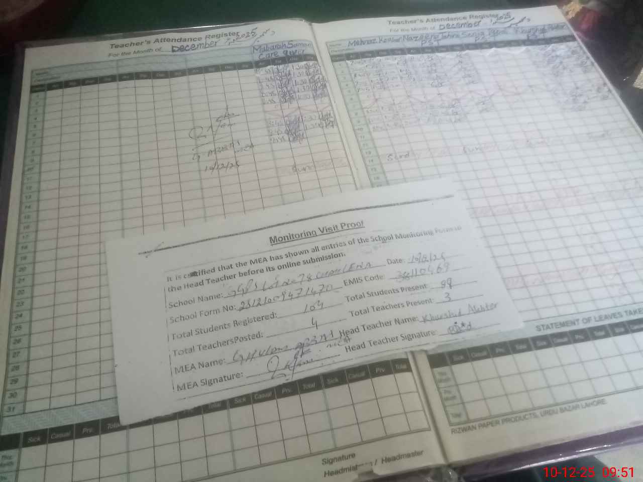 | Attendance Register | Head Teacher | MEA with School | Visit Proof |