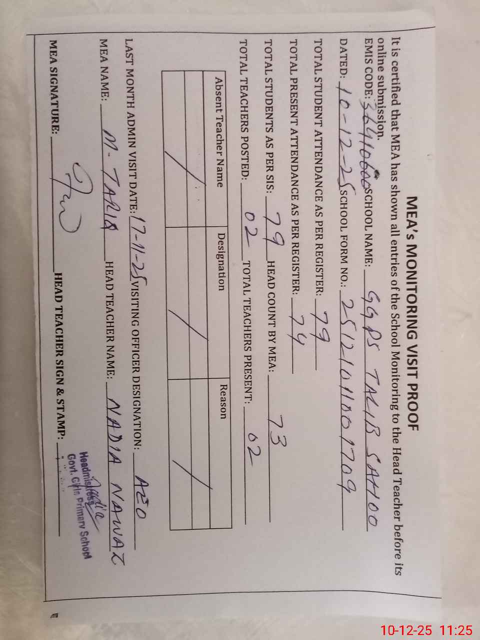 | EMIS Code: 36410600 | Name of School: GGPS TALIB SAHOO | |||