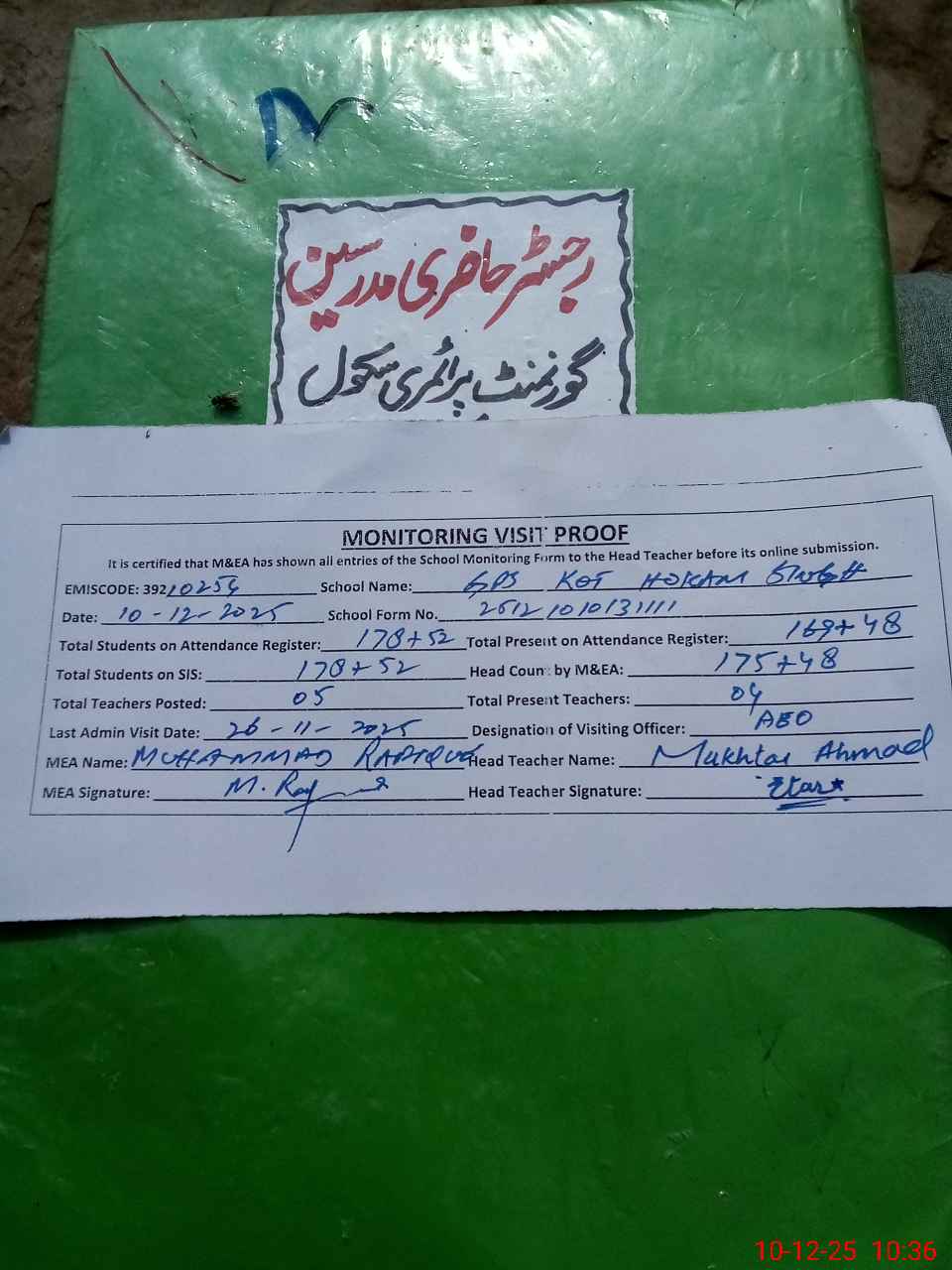 | Attendance Register | Head Teacher | MEA with School | Visit Proof |