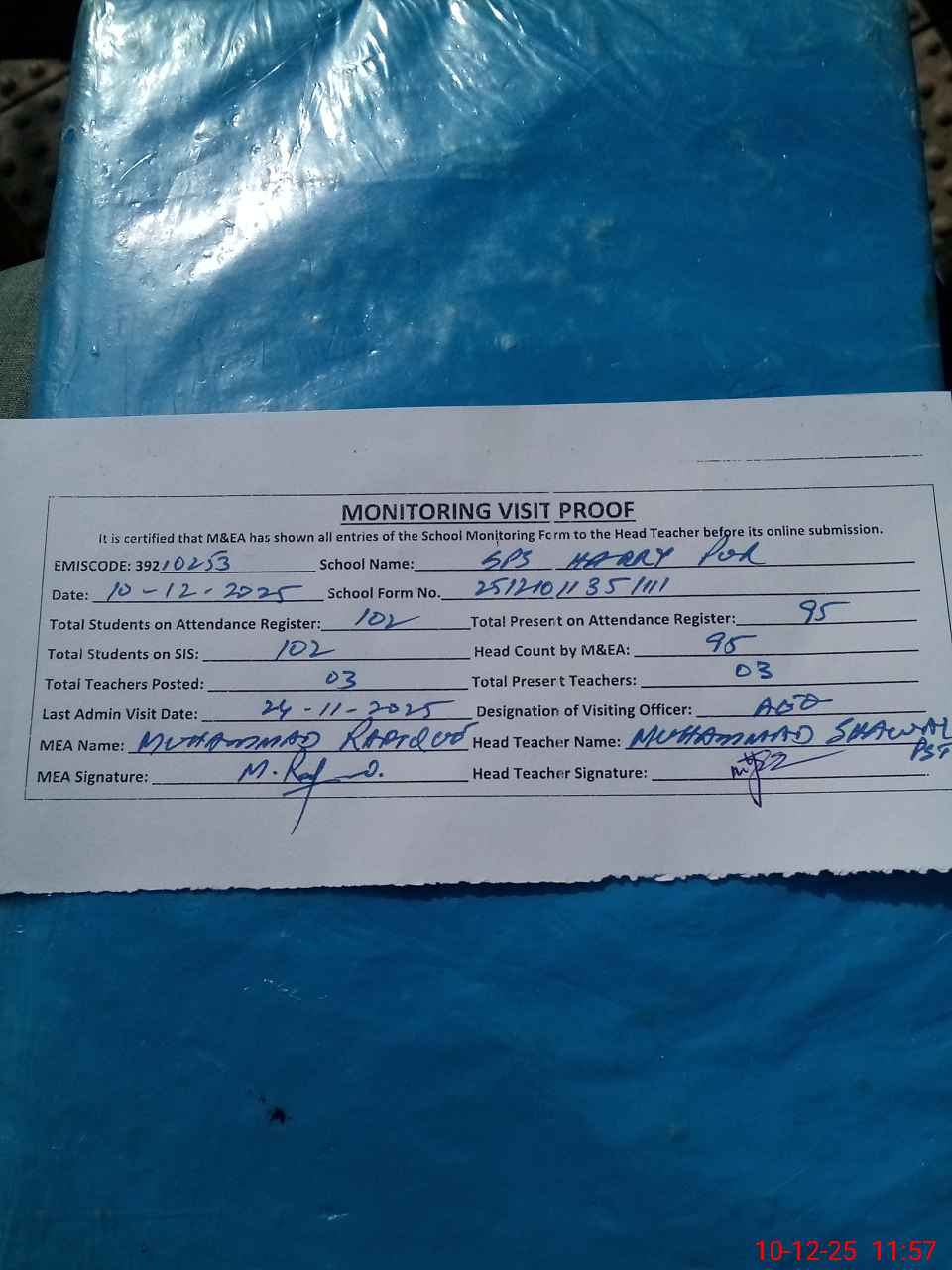 | Attendance Register | Head Teacher | MEA with School | Visit Proof |