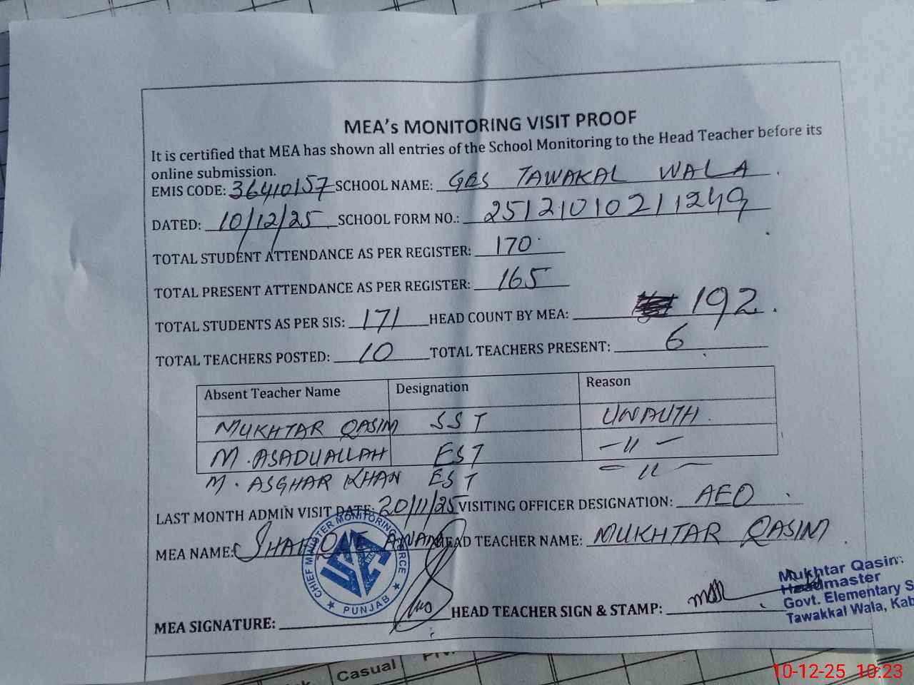 | Attendance Register | Head Teacher | MEA with School | Visit Proof |