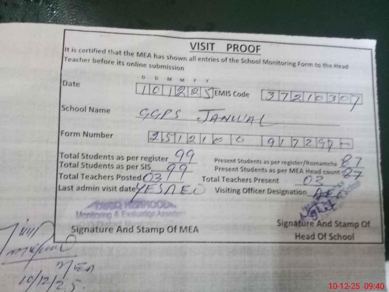 | EMIS Code: 37210307 | Name of School: GGPS JANWAL | |||