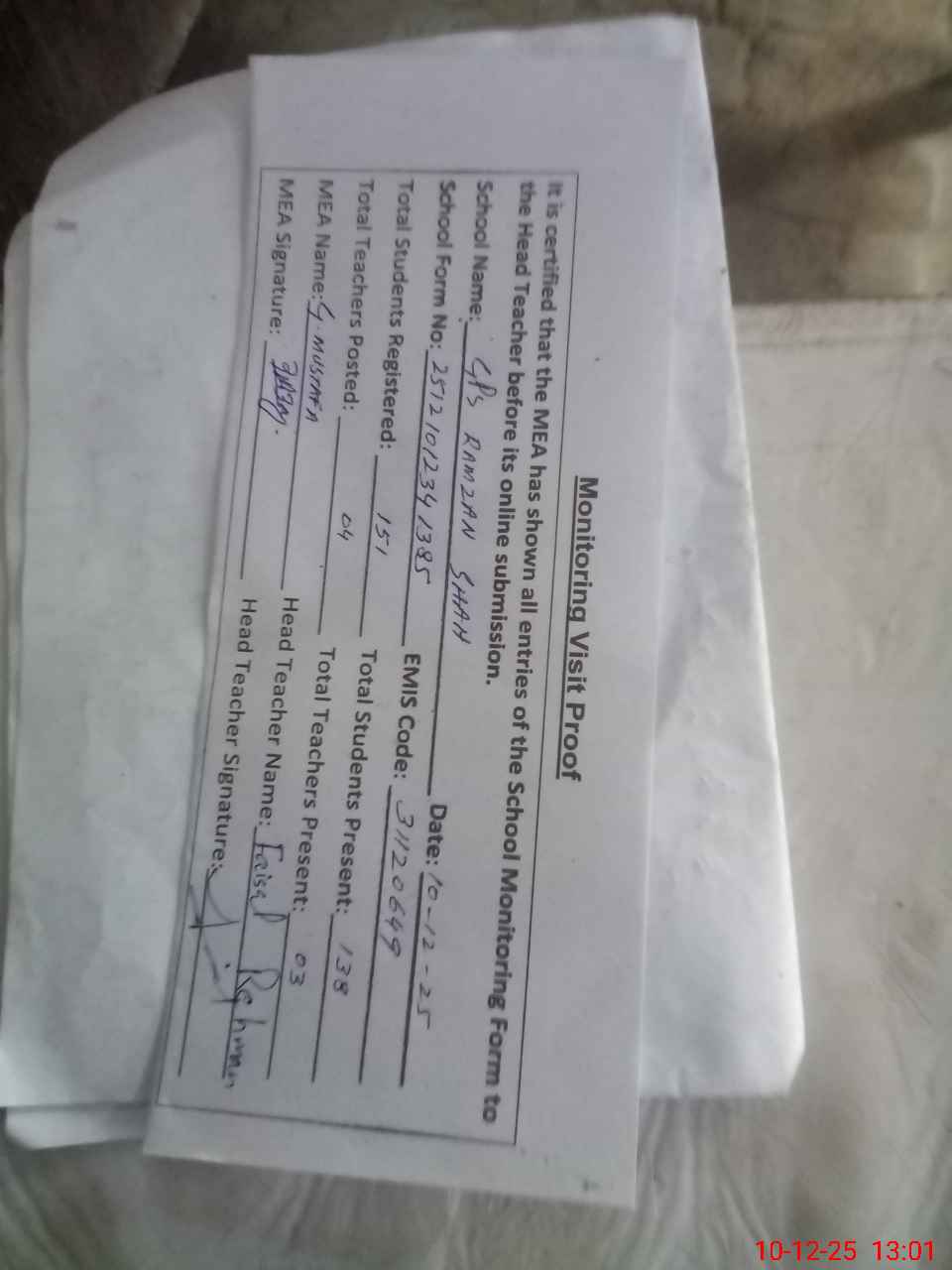 | Attendance Register | Head Teacher | MEA with School | Visit Proof |