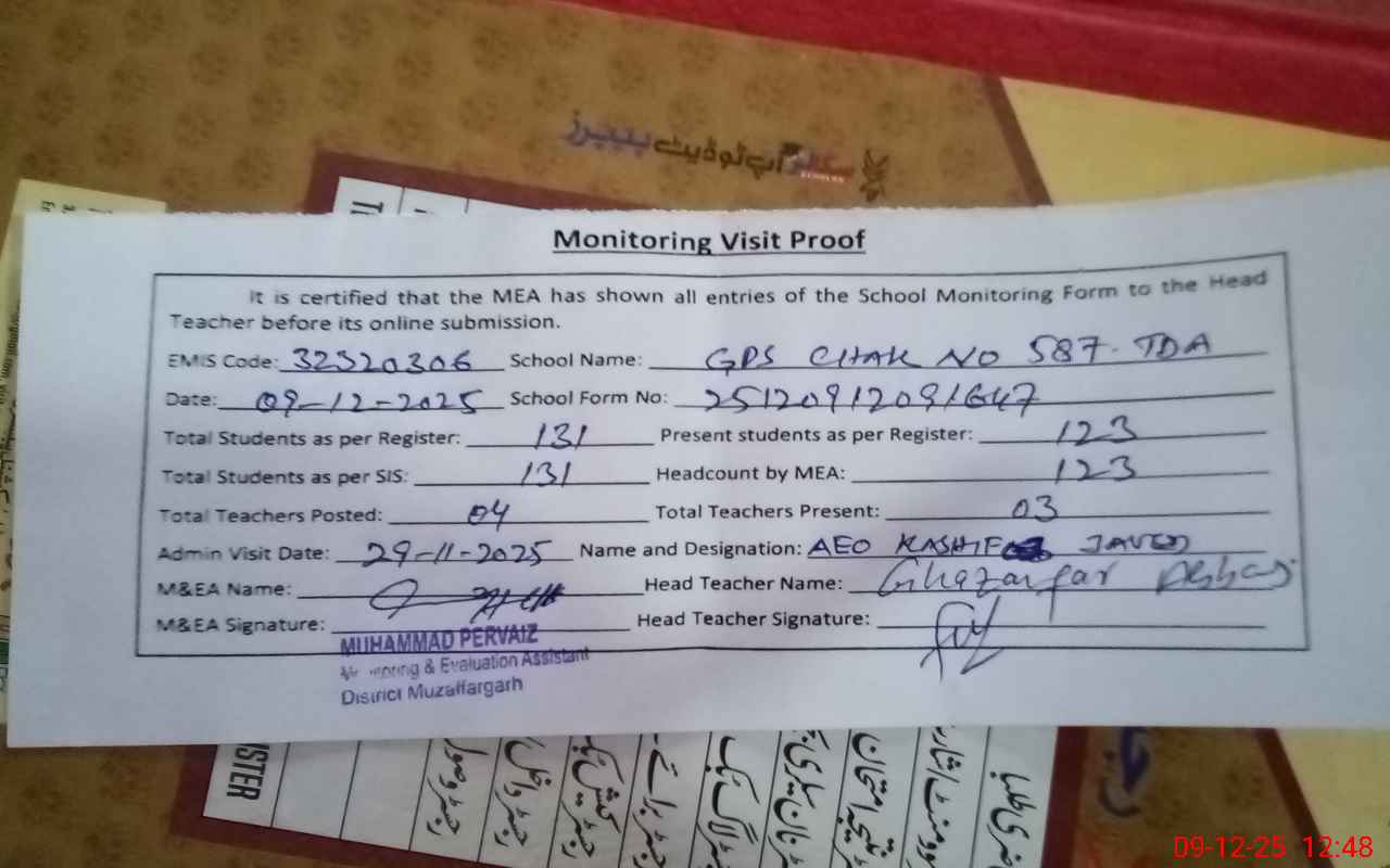 | EMIS Code: 32320306 | Name of School: GPS CHAK NO.587 TDA | |||