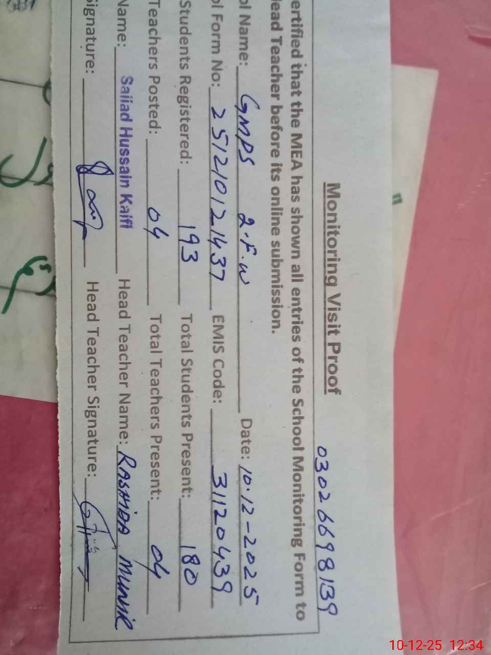 | EMIS Code: 31120439 | Name of School: GMPS CHAK NO. 2/FW | |||