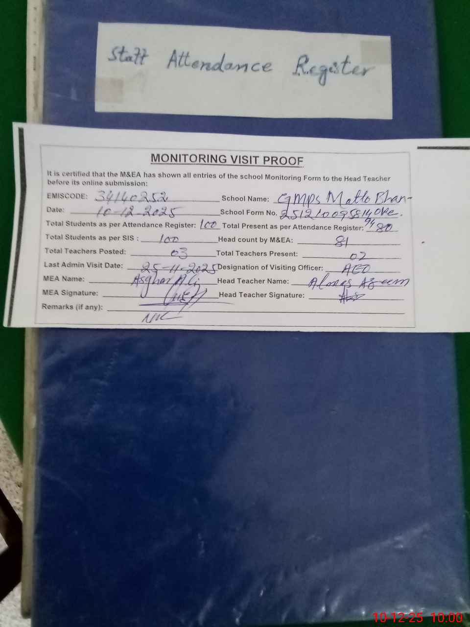 | Attendance Register | Head Teacher | MEA with School | Visit Proof |
