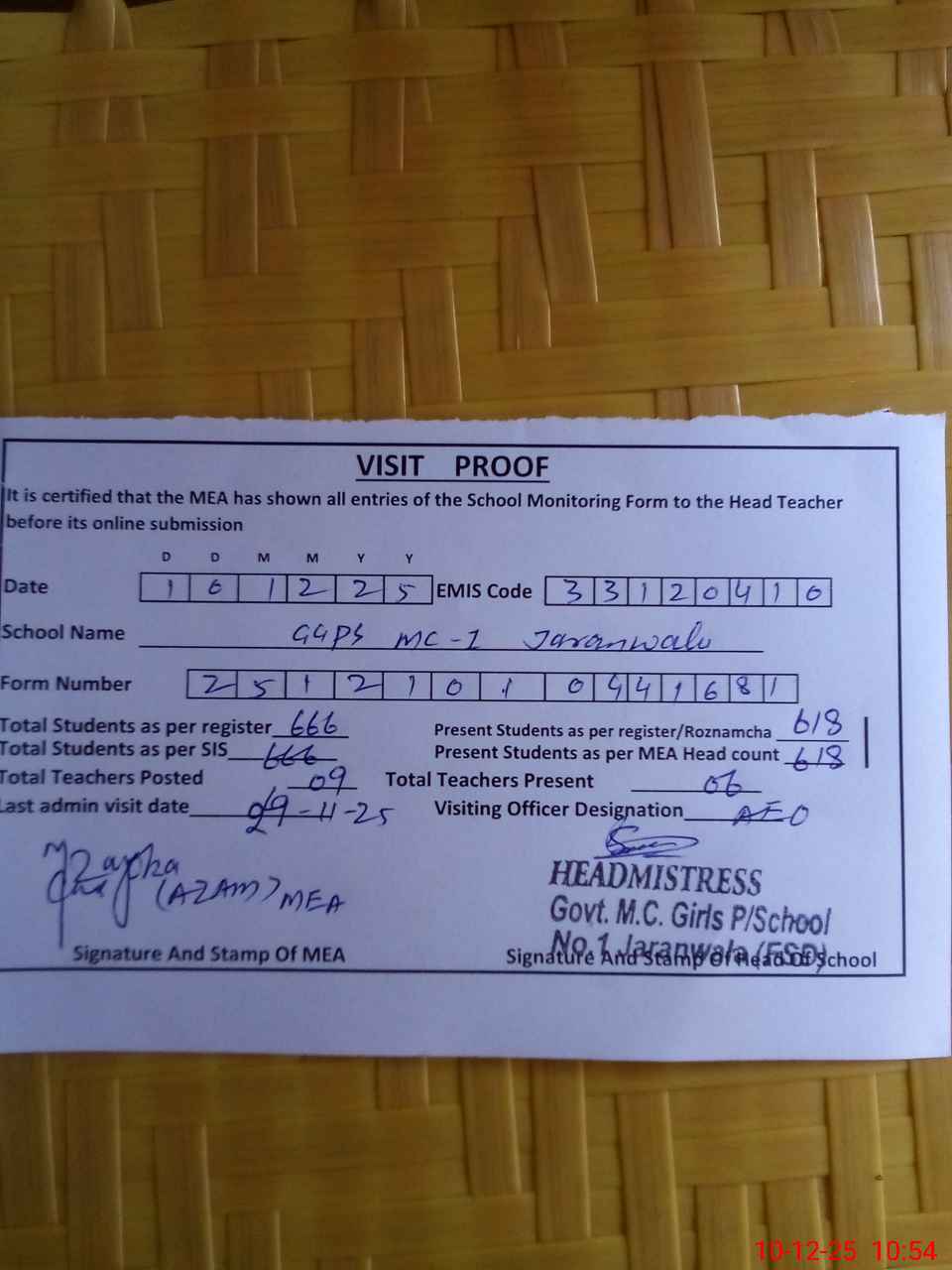 | Attendance Register | Head Teacher | MEA with School | Visit Proof |