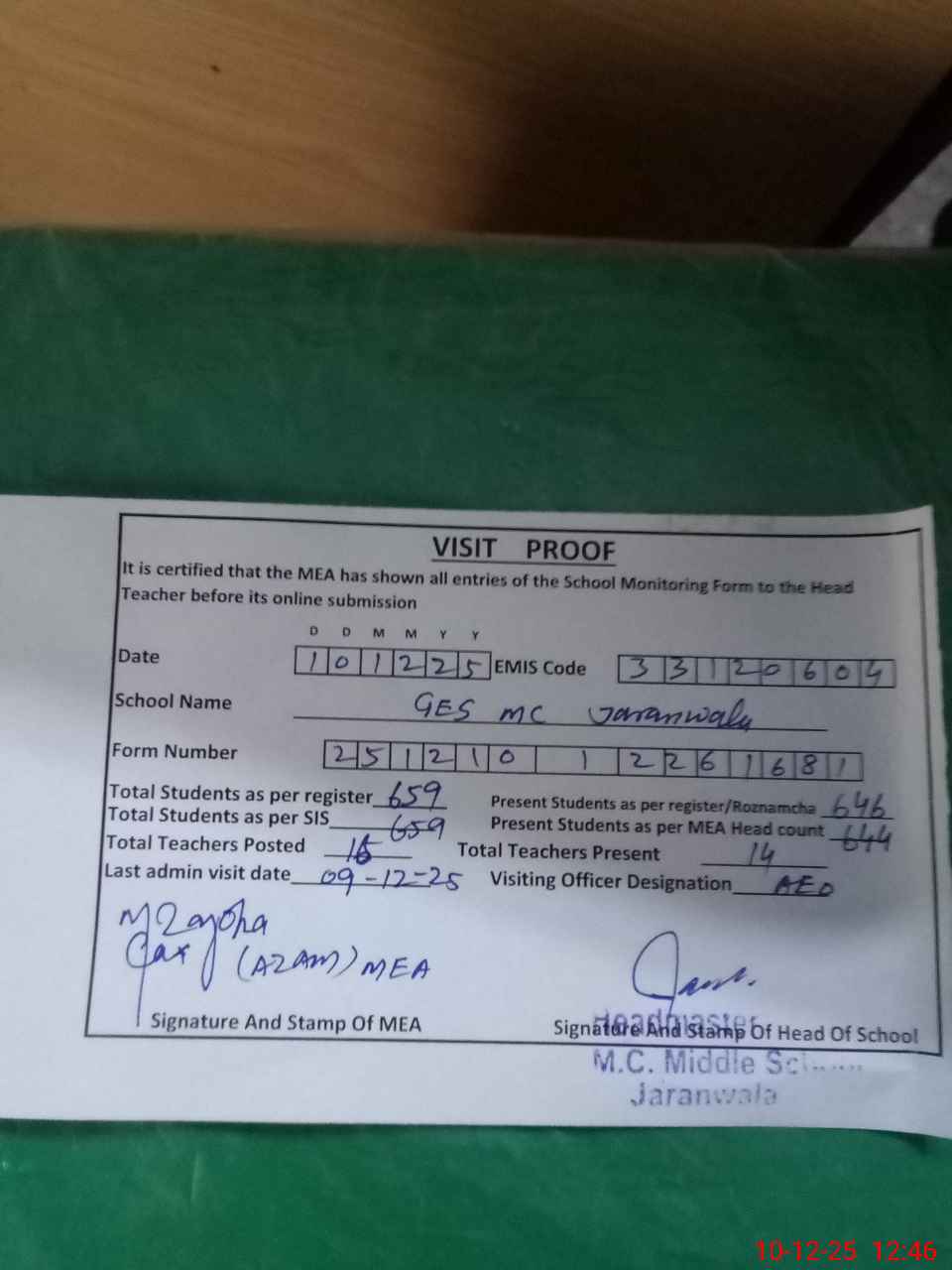| EMIS Code: 33120604 | Name of School: GES MC JARANWALA | |||