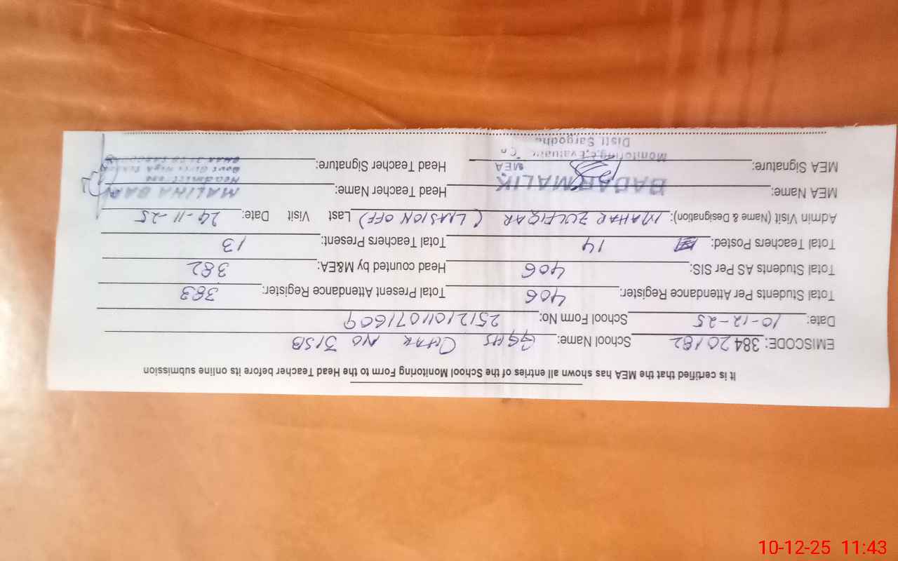 | Certified that this School was Inspected by the Undersigned MEA/DMO Today and the Information Stated Above is as Per Record. | |||||