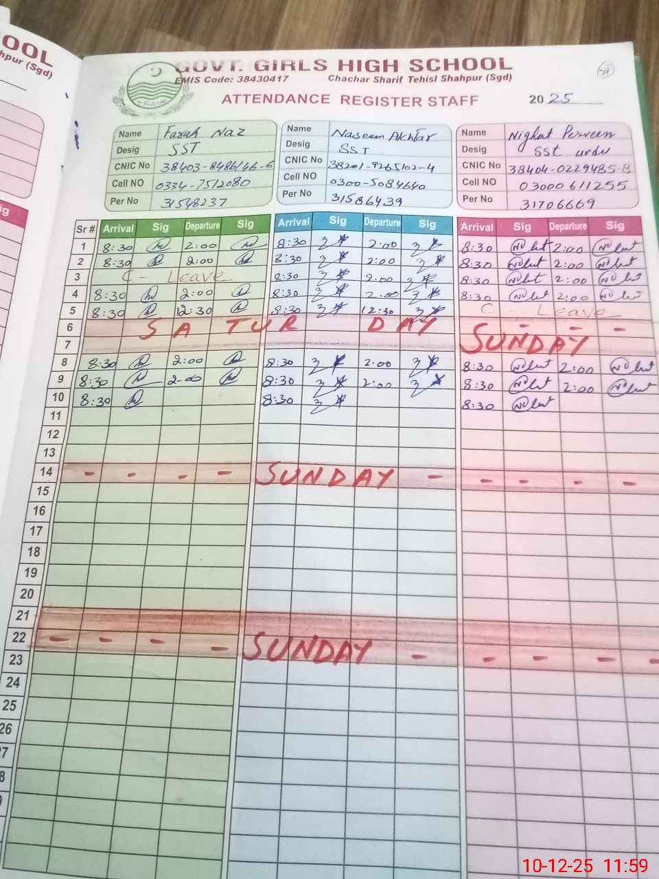 | CNIC | Full Name | Designation | R/C | Absence during last cal. month |