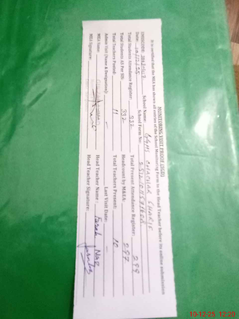 | Attendance Register | Head Teacher | MEA with School | Visit Proof |