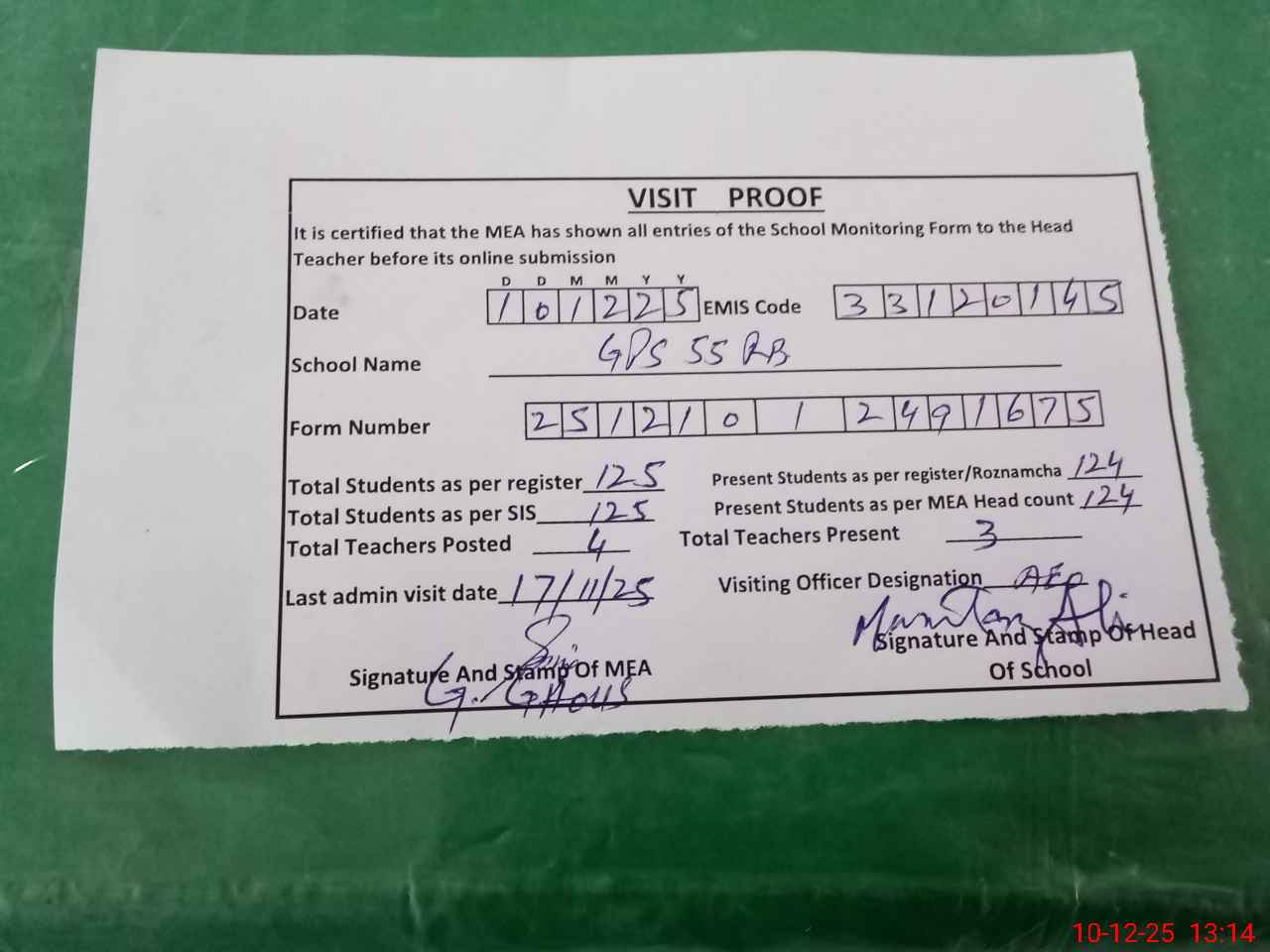| Attendance Register | Head Teacher | MEA with School | Visit Proof |