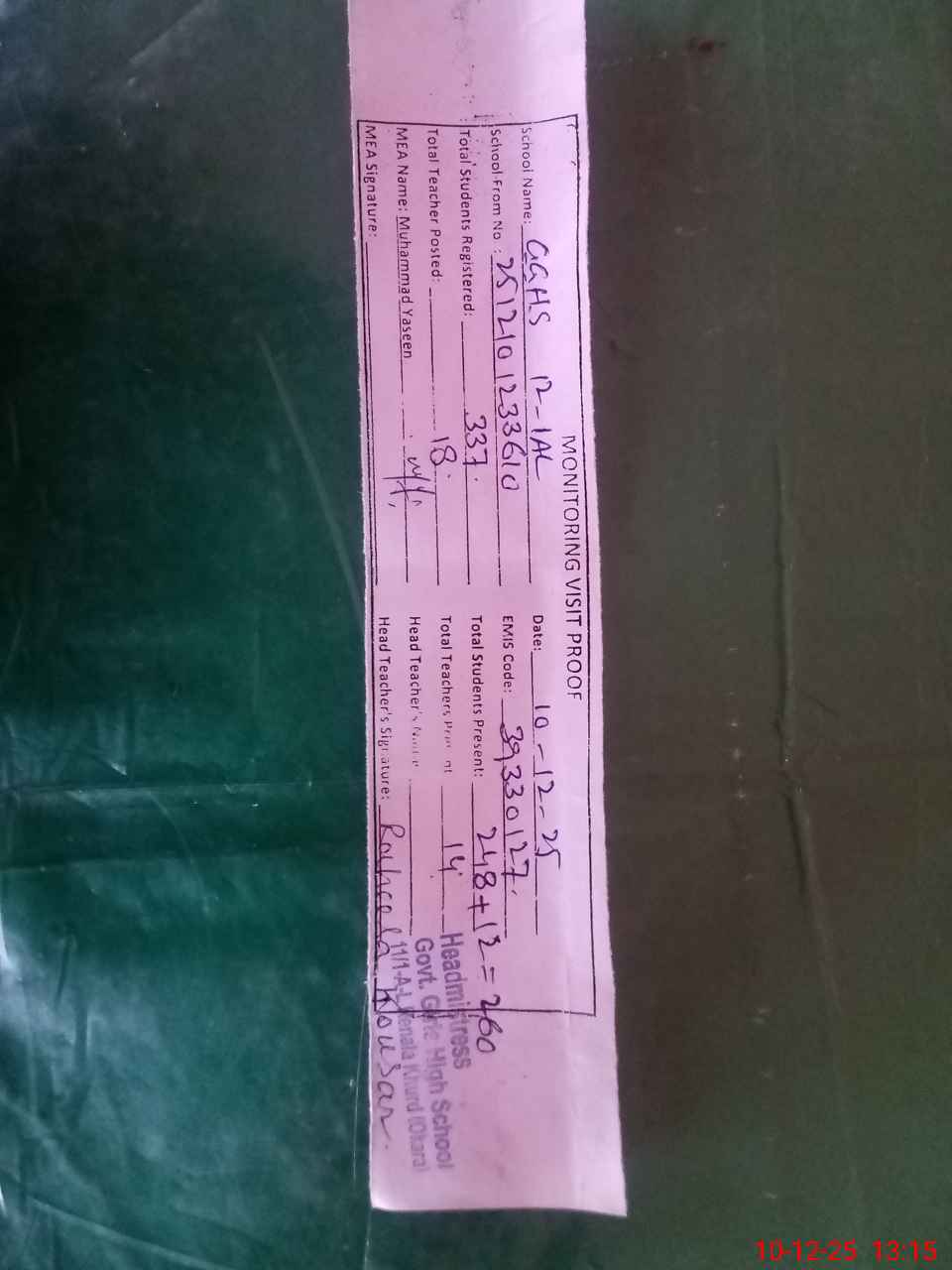 | Certified that this School was Inspected by the Undersigned MEA/DMO Today and the Information Stated Above is as Per Record. | |||||