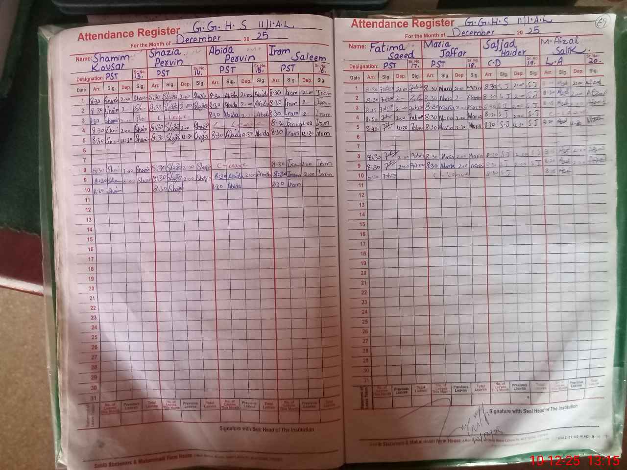 | CNIC | Full Name | Designation | R/C | Absence During Last Calender Month |