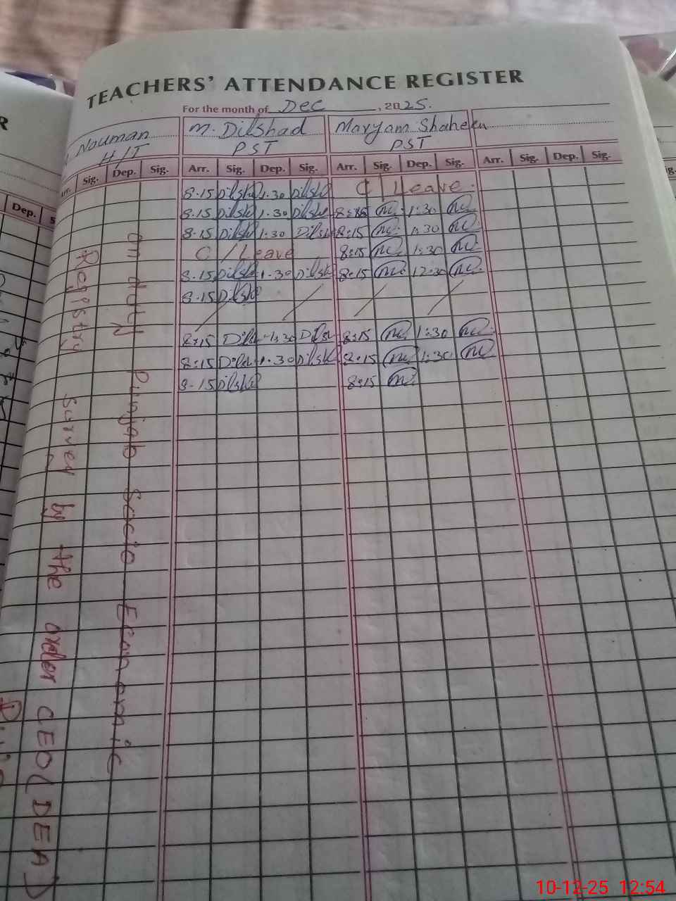 | CNIC | Full Name | Designation | R/C | Absence During Last Calender Month |