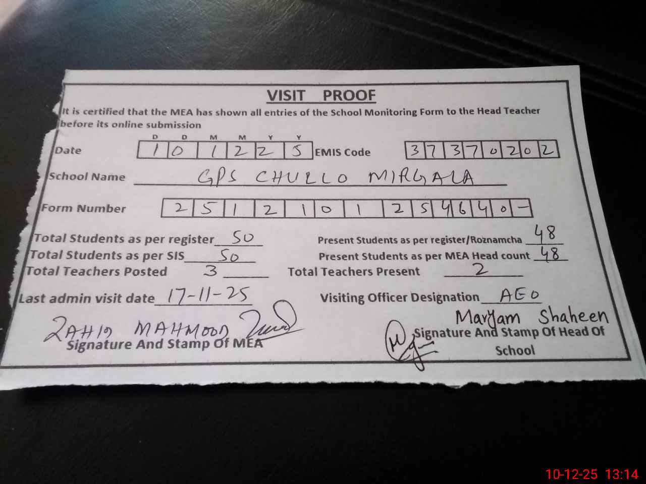 | Attendance Register | Head Teacher | MEA with School | Visit Proof |