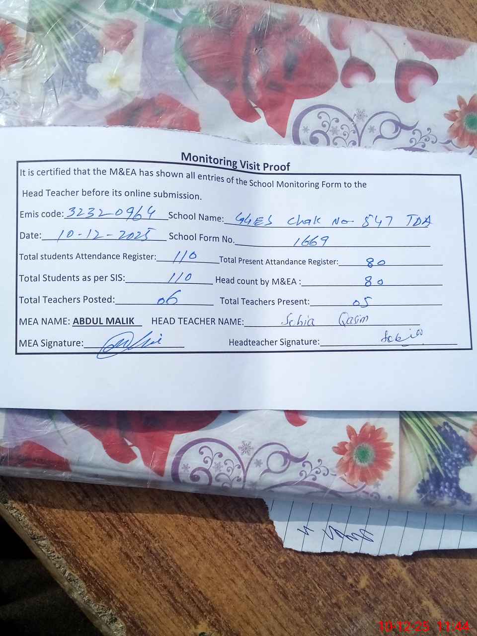 | Attendance Register | Head Teacher | MEA with School | Visit Proof |
