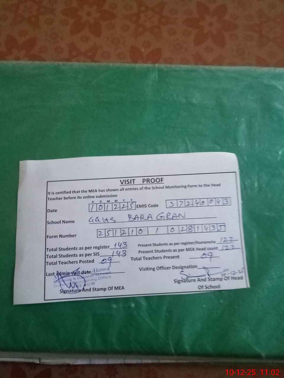 | EMIS Code: 37240043 | Name of School: GGHS BARA GRAN | |||